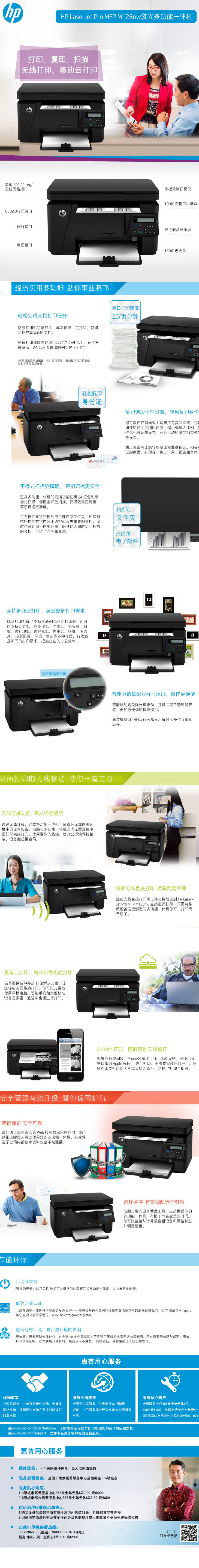 | 包装箱内包含的物品 | HP LaserJet Pro MFP M126nw 激光多功能一体机; 预安装的 HP LaserJet 黑色体验硒鼓(约 700 页); 安装指南; 入门指南; 用户指南; 支持宣传页; 保修指南; CD 上的打印机软件和文档; 电源线; USB 连接线 |