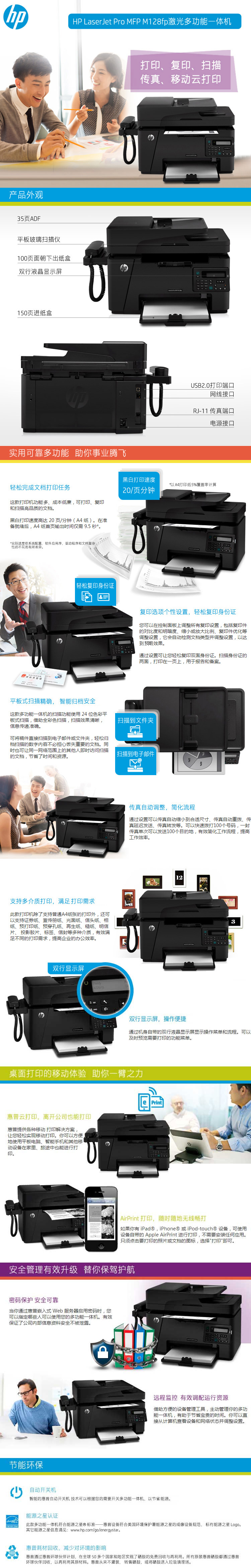 | 包装箱内包含的物品 | HP LaserJet Pro MFP M128fp 激光多功能一体机; 预安装的 HP LaserJet 黑色体验硒鼓(约 700 页); 安装指南; 入门指南; 用户指南; 支持宣传页; 保修指南; CD 上的打印机软件和文档; 电源线; USB 连接线; 电话线 |