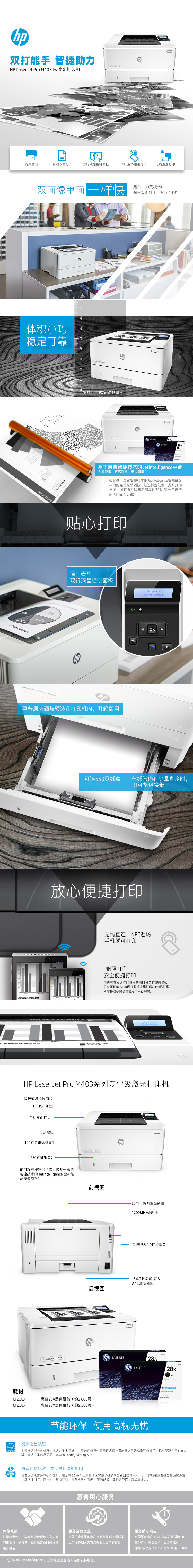 | 包装箱内包含的物品 | HP LaserJet Pro M403dw; 预安装的 HP 28A LaserJet 黑色硒鼓(约 3000 页); 入门指南; 安装海报; 支持宣传页; 保修指南; CD-ROM 上的打印机文档和软件; 电源线; USB 连接线 |