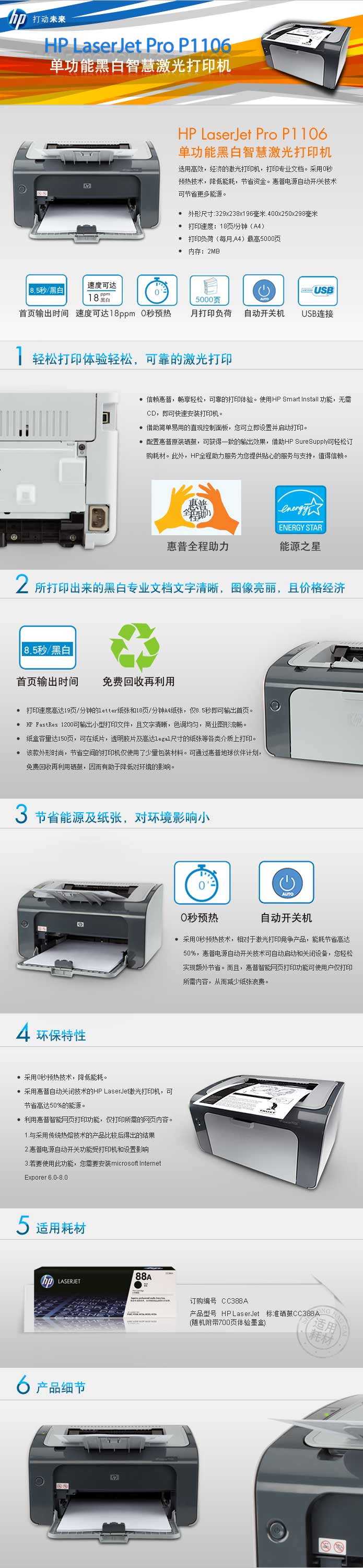 | 包装箱内包含的物品 | HP LaserJet Pro P1106 激光打印机; HP LaserJet 黑色体验硒鼓(约 700 页); 电源线; 打印机软件与文档 CD; 入门指南; 支持宣传页; USB 连接线(仅亚太地区) |